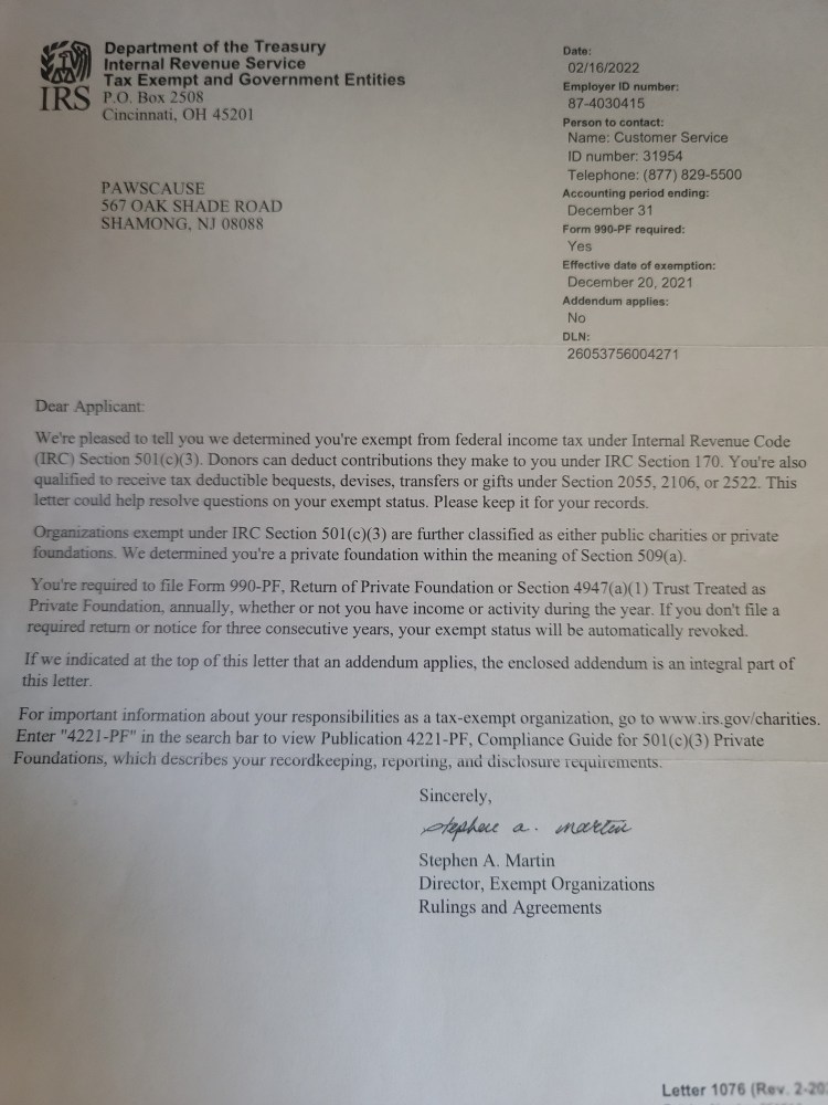 Pawscause.org is a registered NJ non-profit (identification number 0450743294). As of December 20, 2021 we are also a registered 501(c)(3) Private Foundation (ID number 87-4030415). We are a registered NJ charity number CH4571700. Donors to PawsCause.org can deduct 100% of the contributions they make under IRC Section 170. Pawscause.org is also able to receive tax deductible bequests, devises, transfers or gifts under Section 2055, 2106, or 2522.