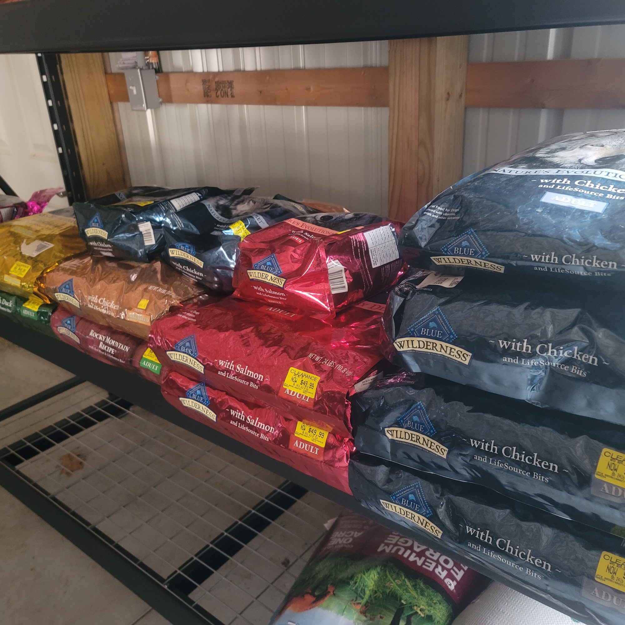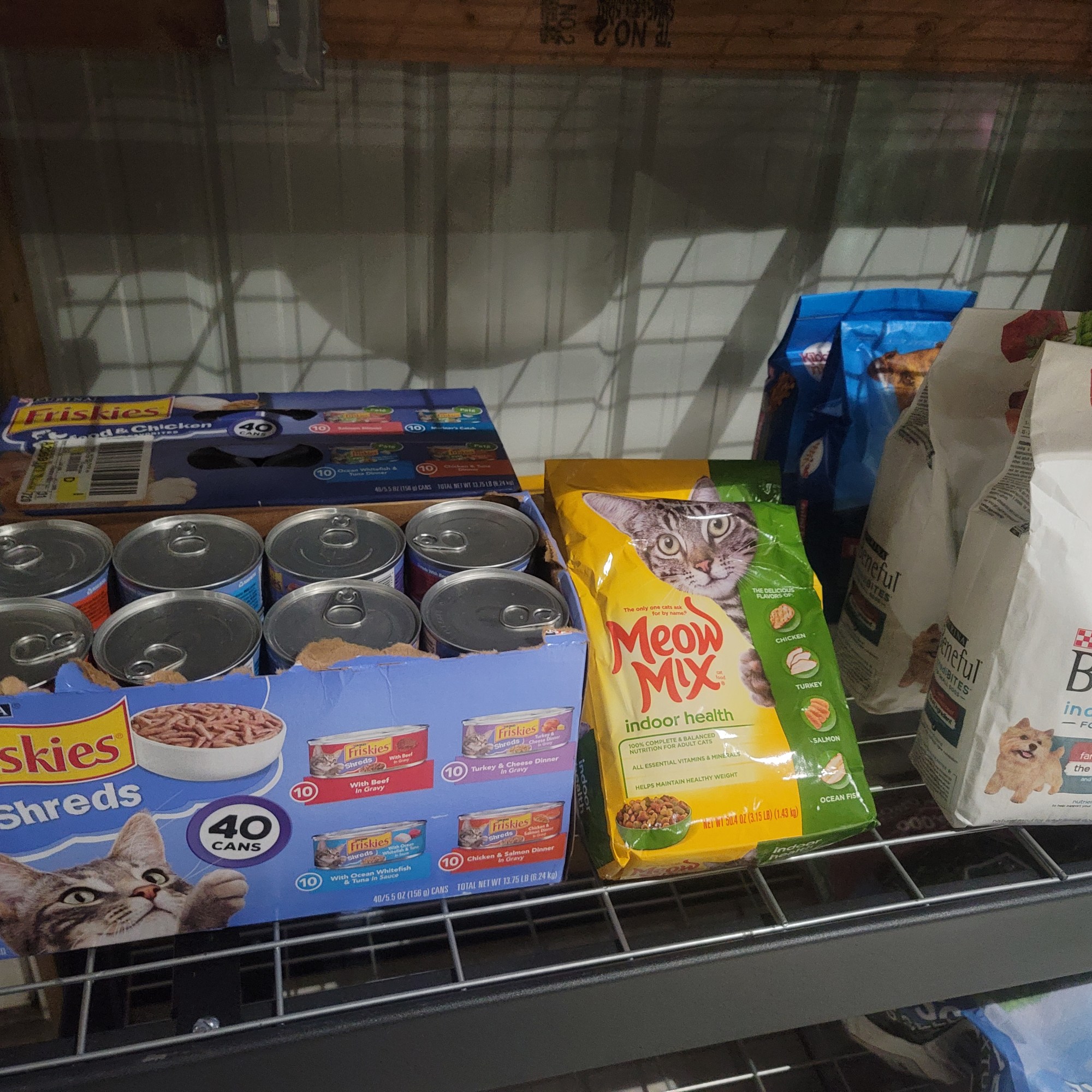 Wet and dry cat food and a selection of dry dog food.