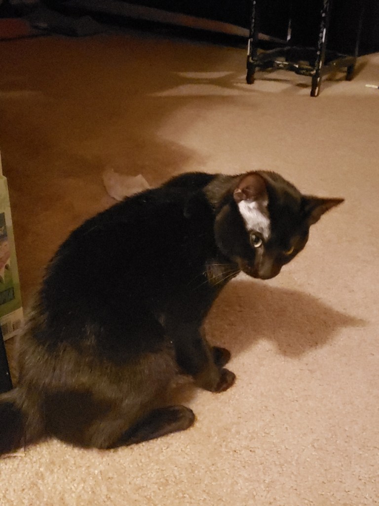 It has taken a week but the cat, now named Richard, has totally come out of his shell. He was placed with a loving family who was specificaly looking for an all black cat. Along with the cat, PawsCause.org donated a welcome home gift package which included a litter pan, litter, cat food, a cat tent, toys, a collar, and other essentials. Richard seems to have settled right in at his new home–he is even playing with the cat toys now.
